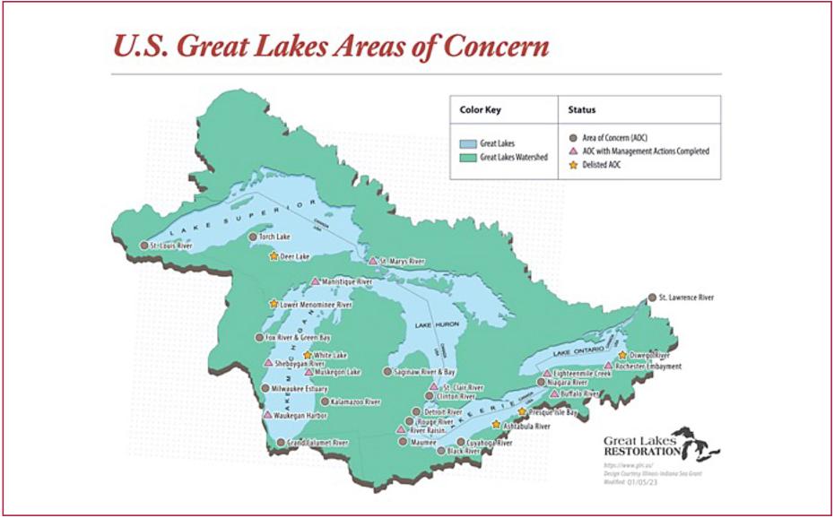 Since the start of the Great Lakes Restoration Initiative, federal agencies and their partners have accelerated cleanup of Areas of Concern — areas designated as the most contaminated sites on the Great Lakes under the Great Lakes Water Quality Agreement. Cleanup of Areas of Concern (AOCs) has led to community and economic revitalization.